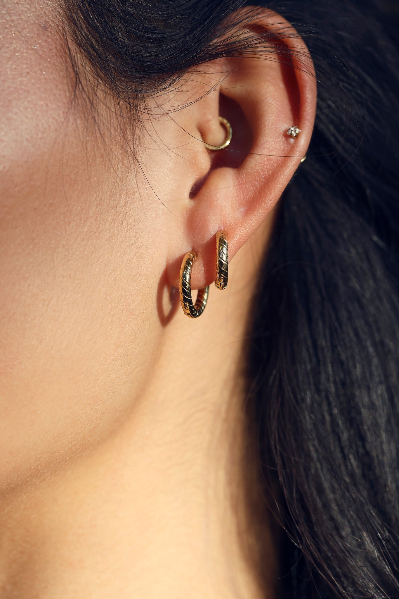 Le coffret Marie se compose de deux paires de créoles finement striées, de tailles différentes pour une jolie composition d’oreille, avec de délicates rainures qui apportent relief et élégance, pour un style à la fois moderne et intemporel.