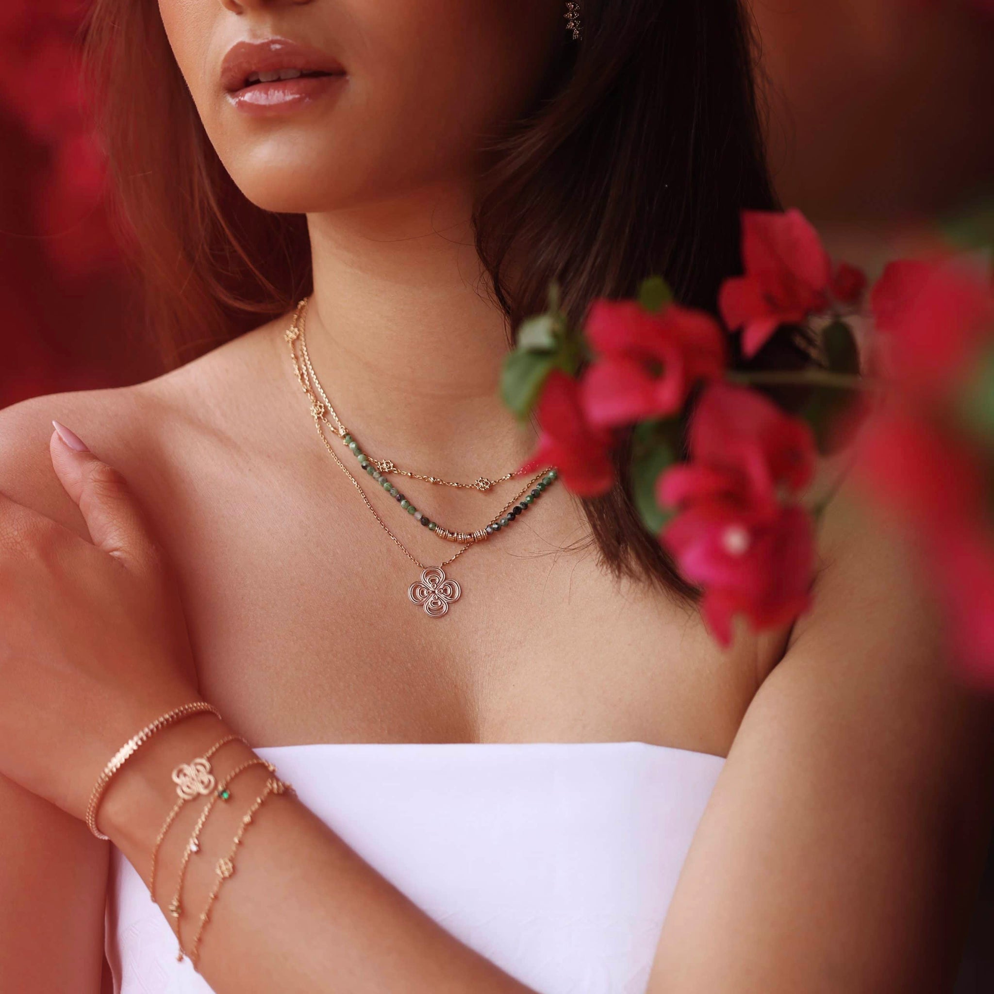 La chance ne vous quittera plus avec Zeina, un bracelet délicat orné d’un trèfle ajouré en finition dorée. Symbole de protection et de positivité, il se porte au quotidien comme un véritable talisman, tout en apportant une touche de raffinement à votre poignet.