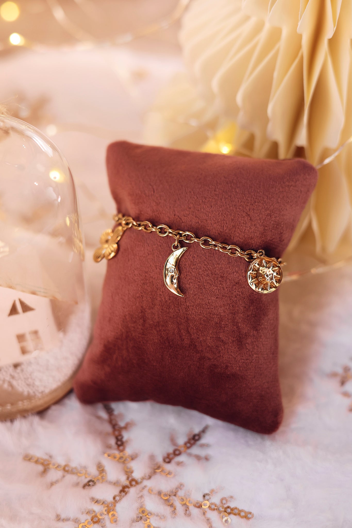 LORNA - Bracelet doré en maille avec pendentifs lune, fleur, soleil, coeur et étoile