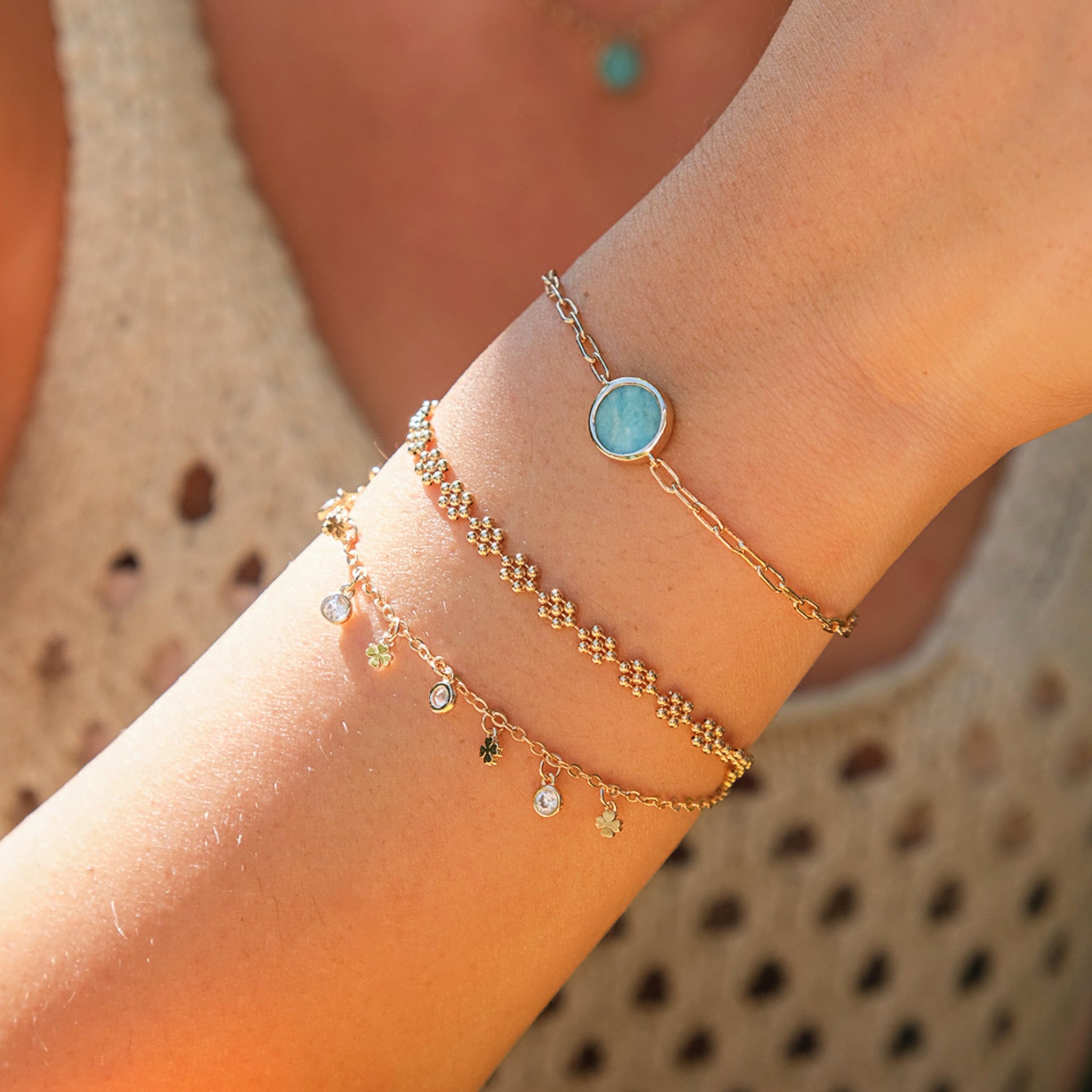 On craque pour Mavana, un bracelet raffiné orné de multiples pampilles, dont de délicats trèfles, symboles de chance et de positivité. Chaque détail est pensé pour vous accompagner avec élégance et énergie bienveillante.