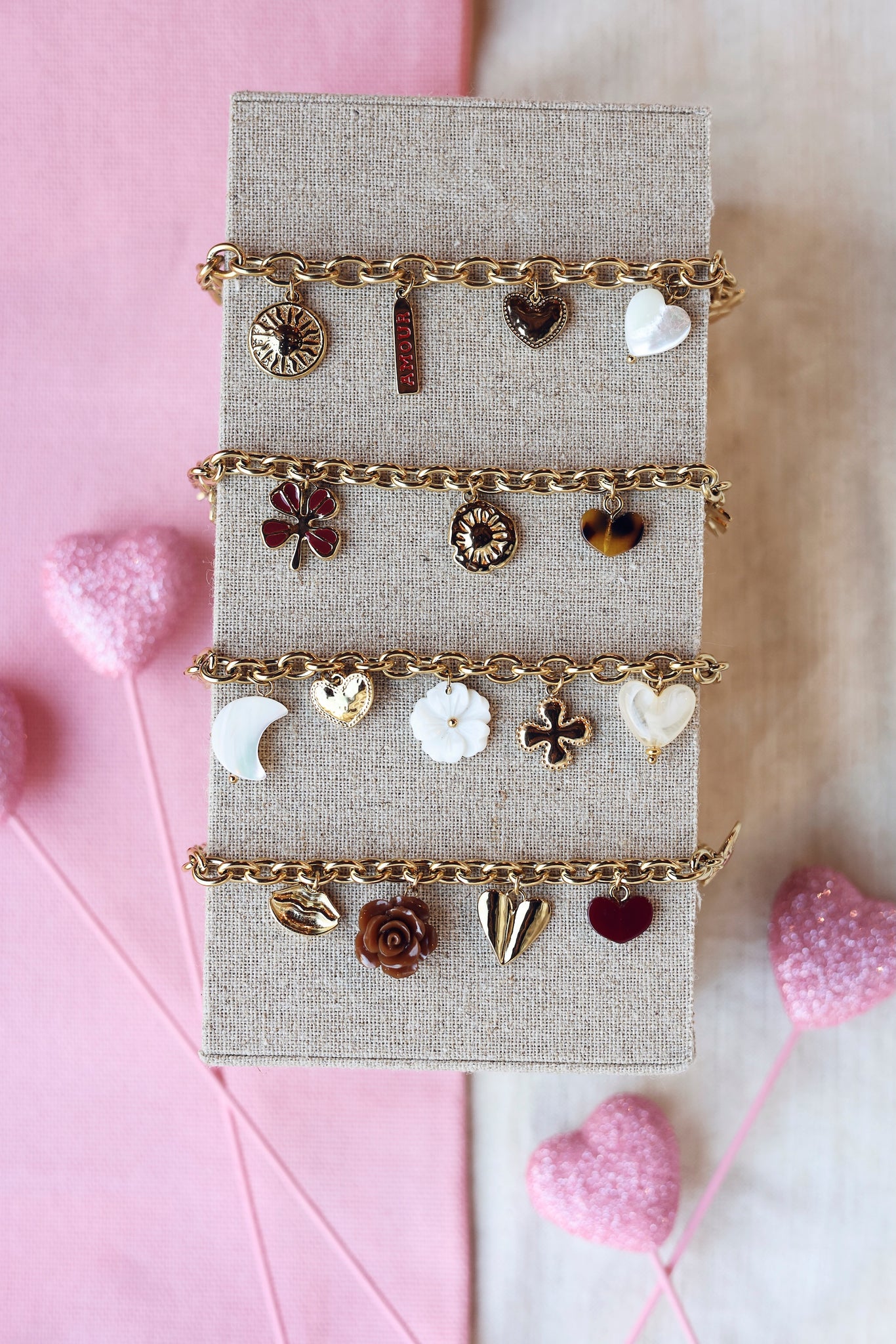 NATTY - Bracelet doré maille avec pendentifs coeurs, lune, fleur et trèfle