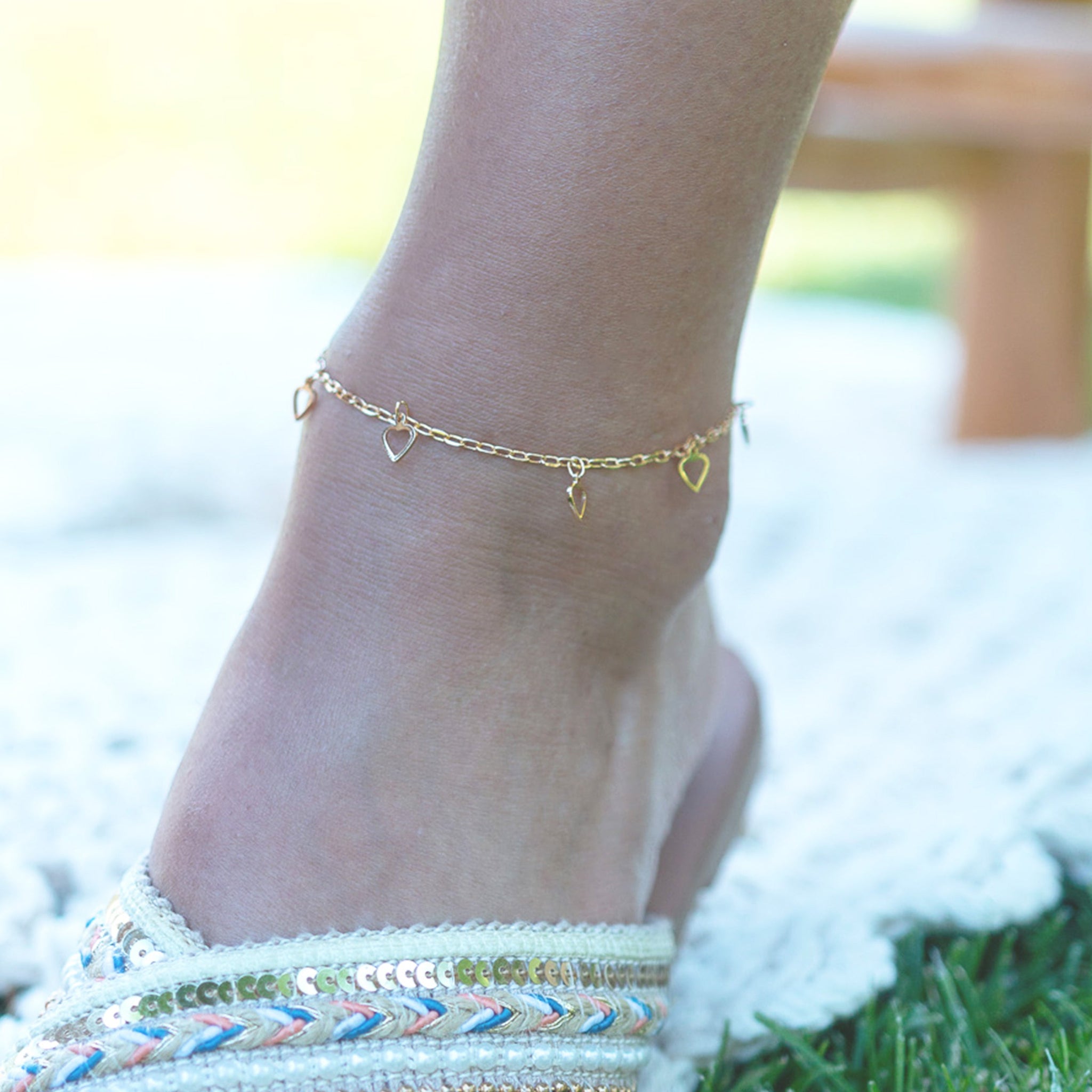 Craquez pour Faïna, notre chaîne de cheville aux pendentifs en forme de petits cœurs délicats.