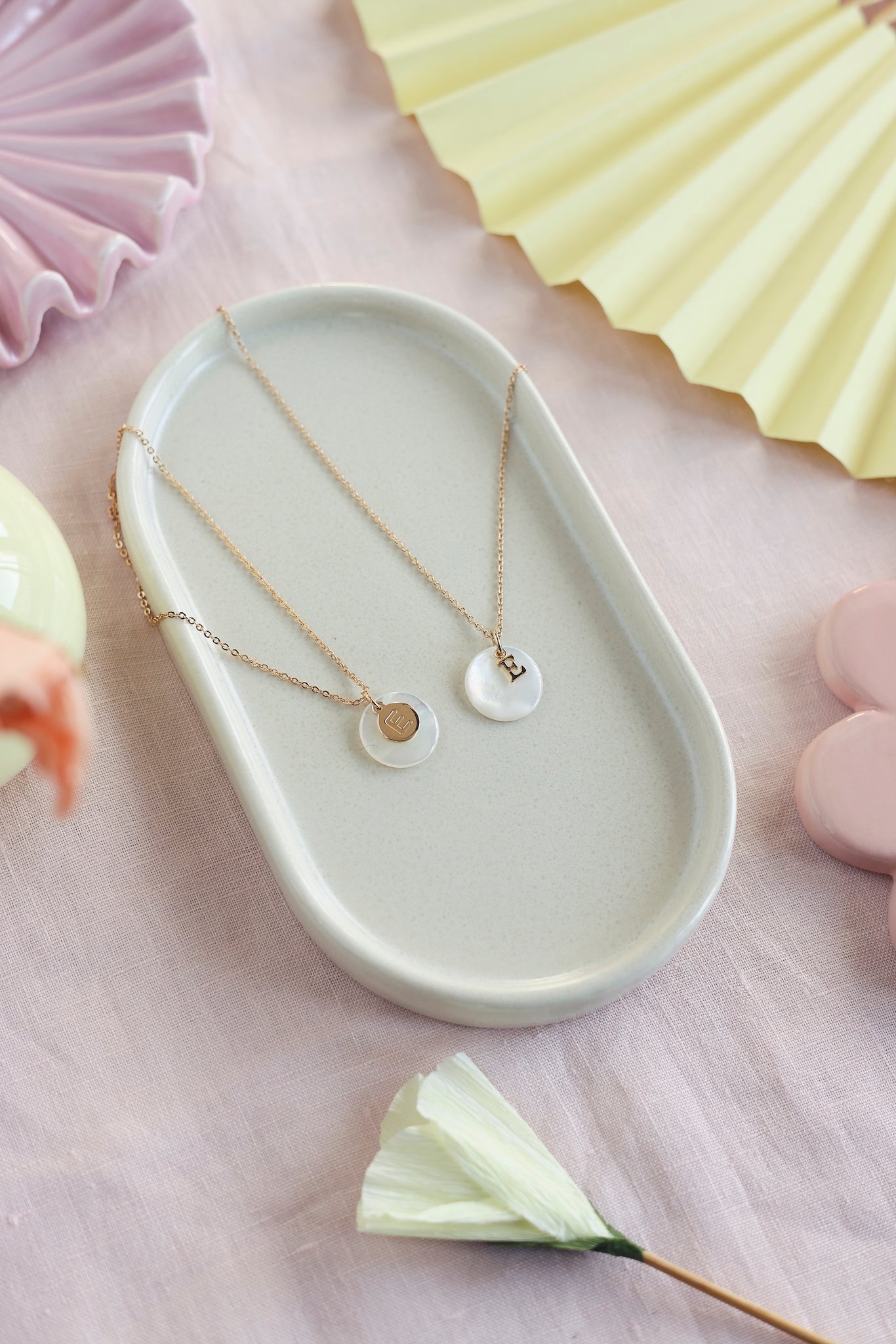 Pendentif rond en nacre pour collier personnalisable doré initiale et charm