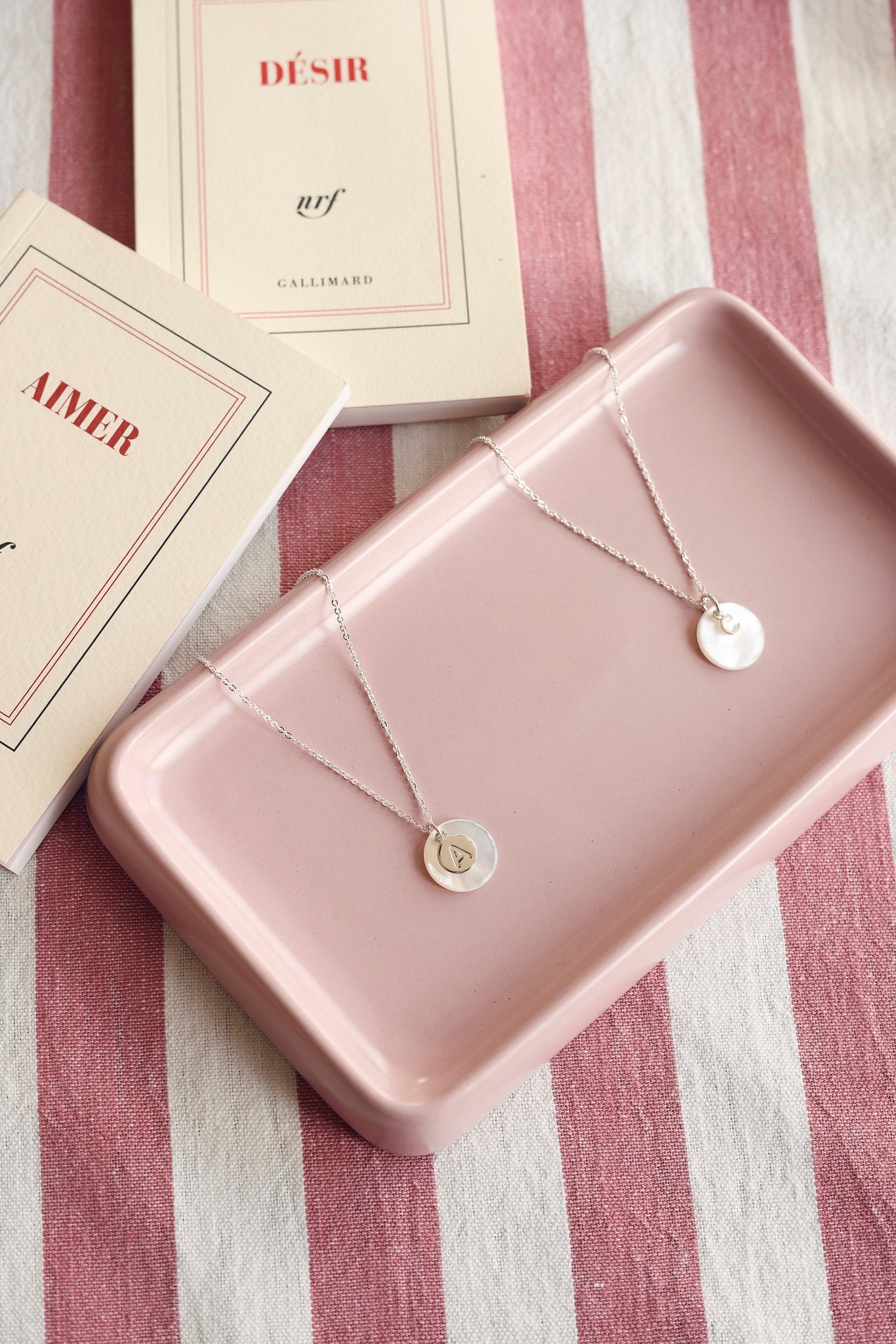 Pendentif rond en nacre pour collier personnalisable en argent initiale et charm