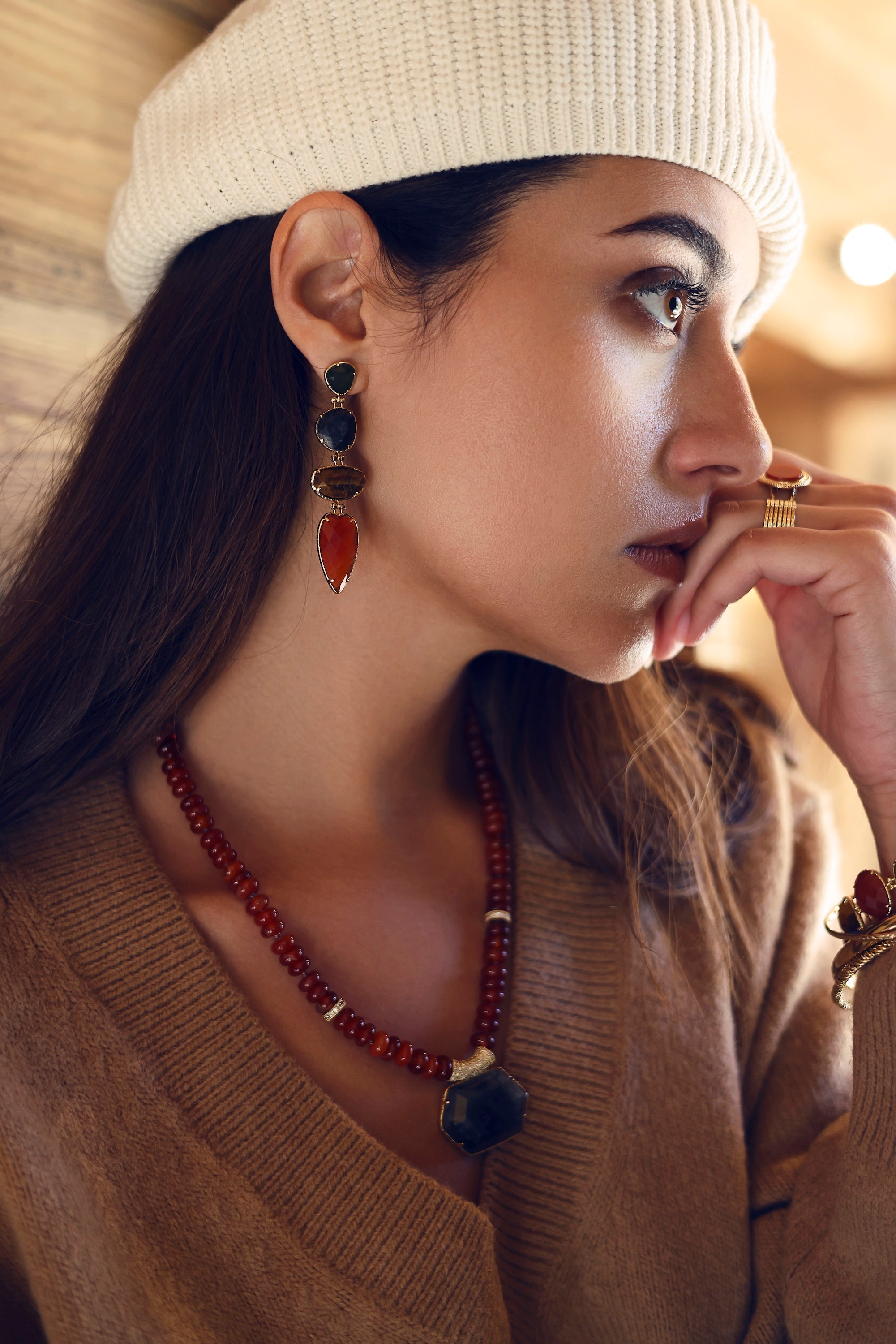 Acier inoxydable doré, cornaline, oeil de tigre, jaspe vert, tourmaline verte.