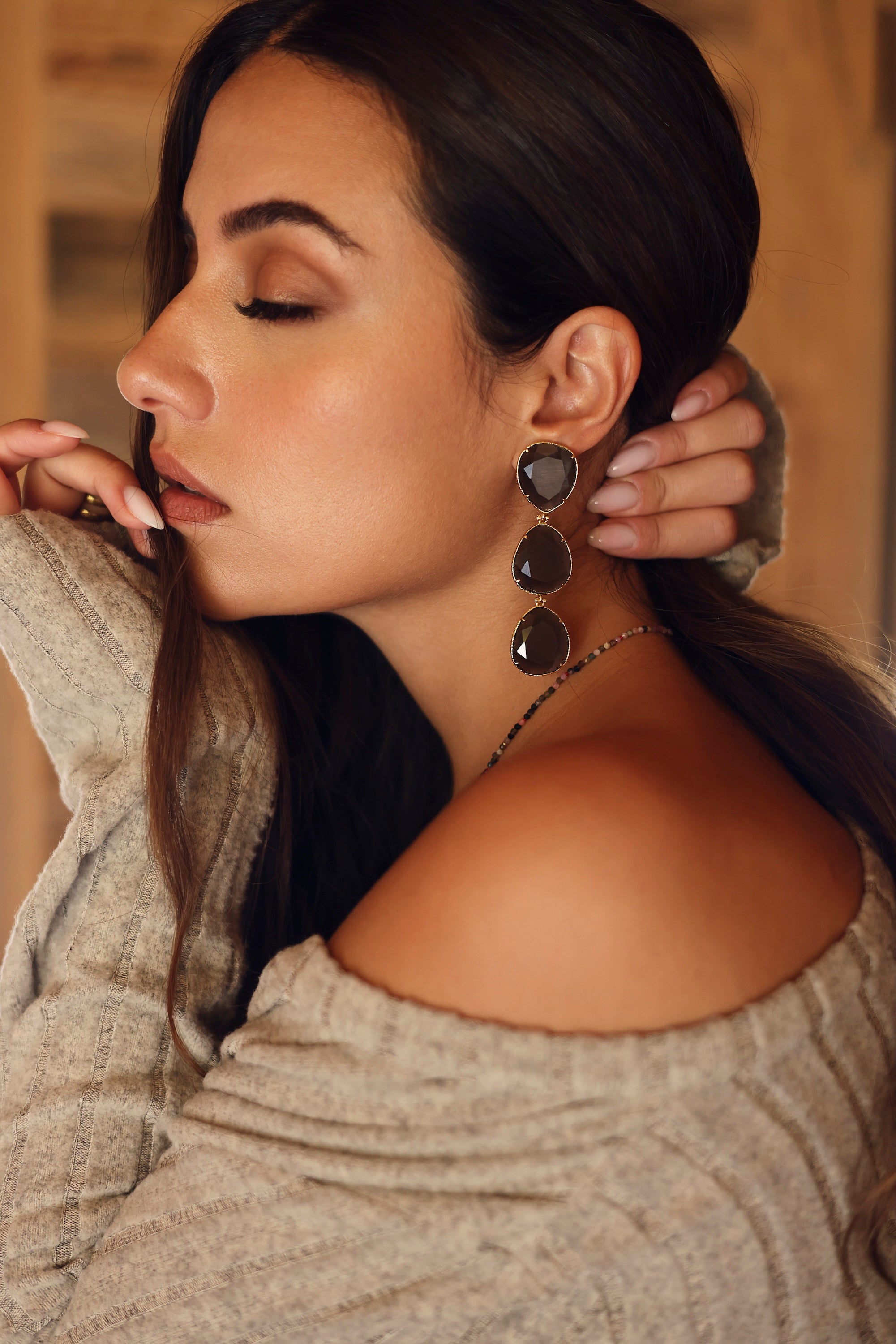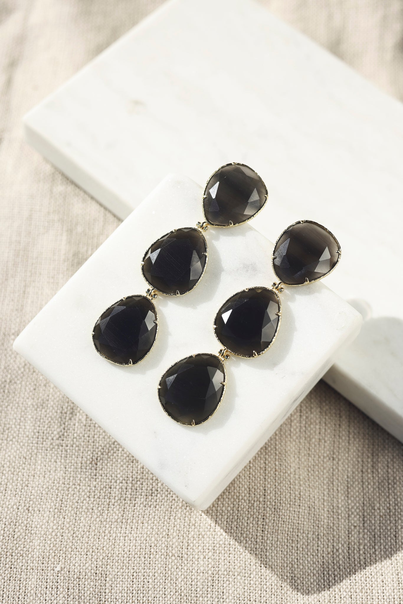 GISELE - Boucles d'oreilles pendantes dorées ornées de cristaux effet oeil de chat gris