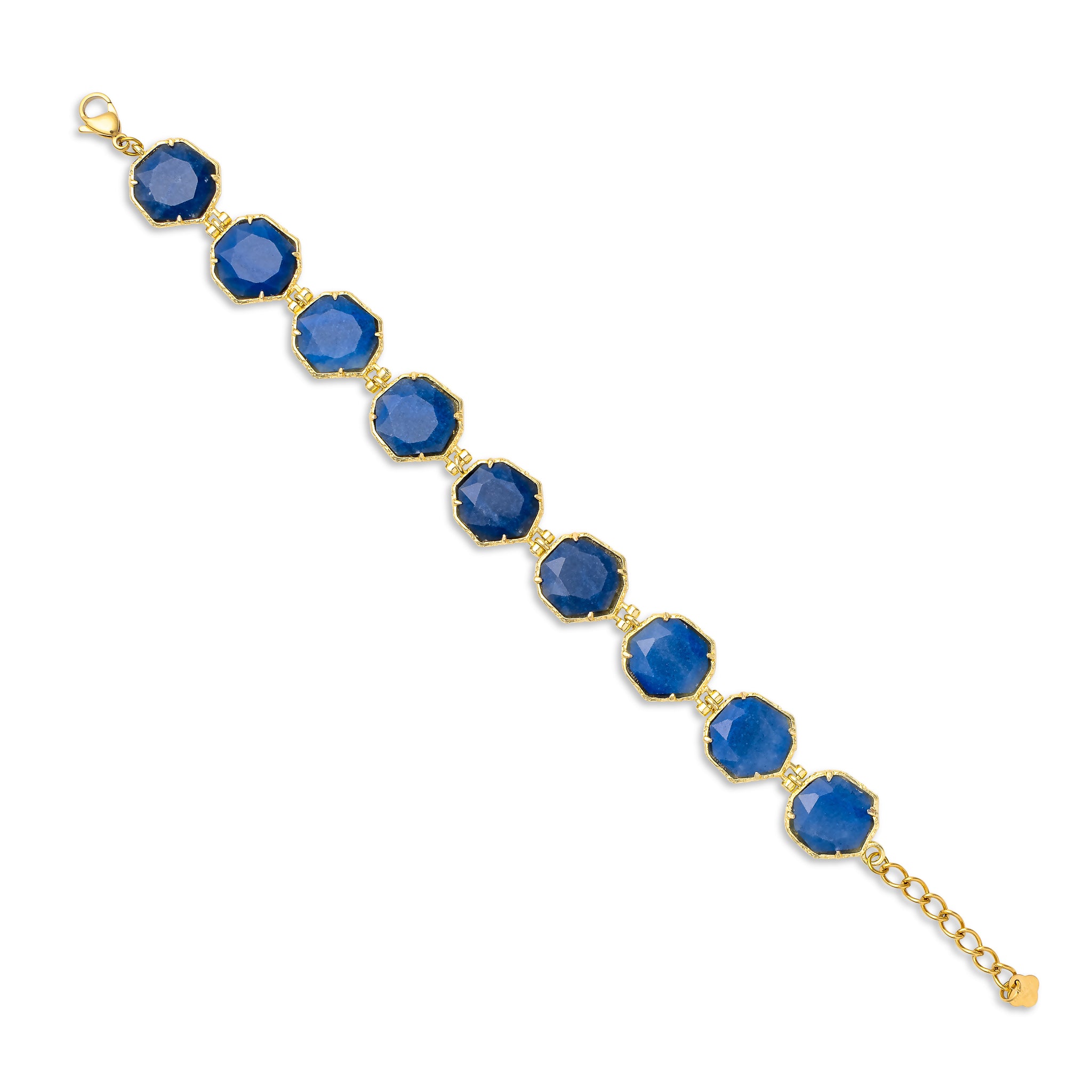 Le bracelet Rony est un modèle doré composé de petites pierres naturelles de sodalite, reconnue pour sa belle couleur bleu profond.