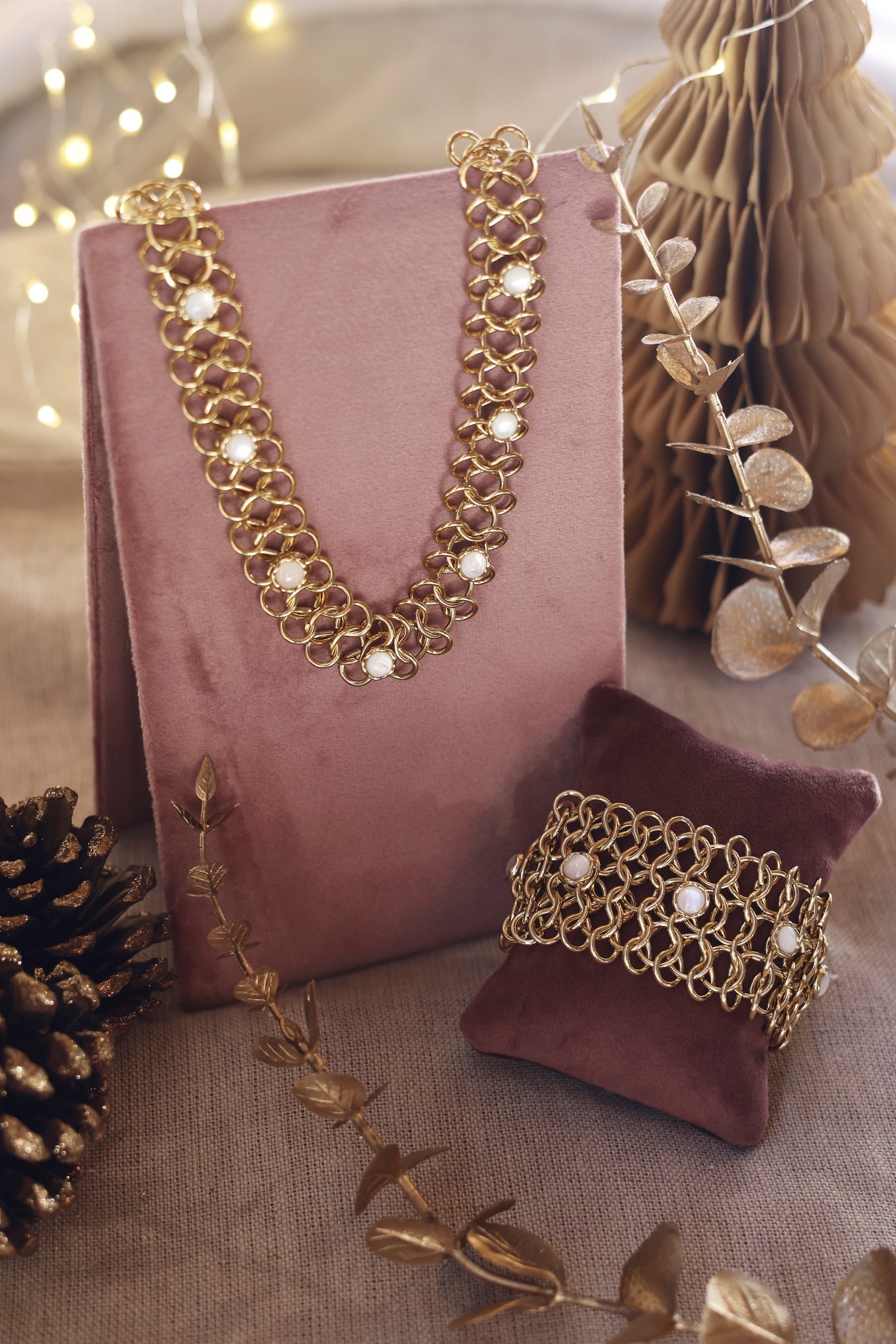 DOLLI - Collier statement doré en maille épaisse orné de nacres