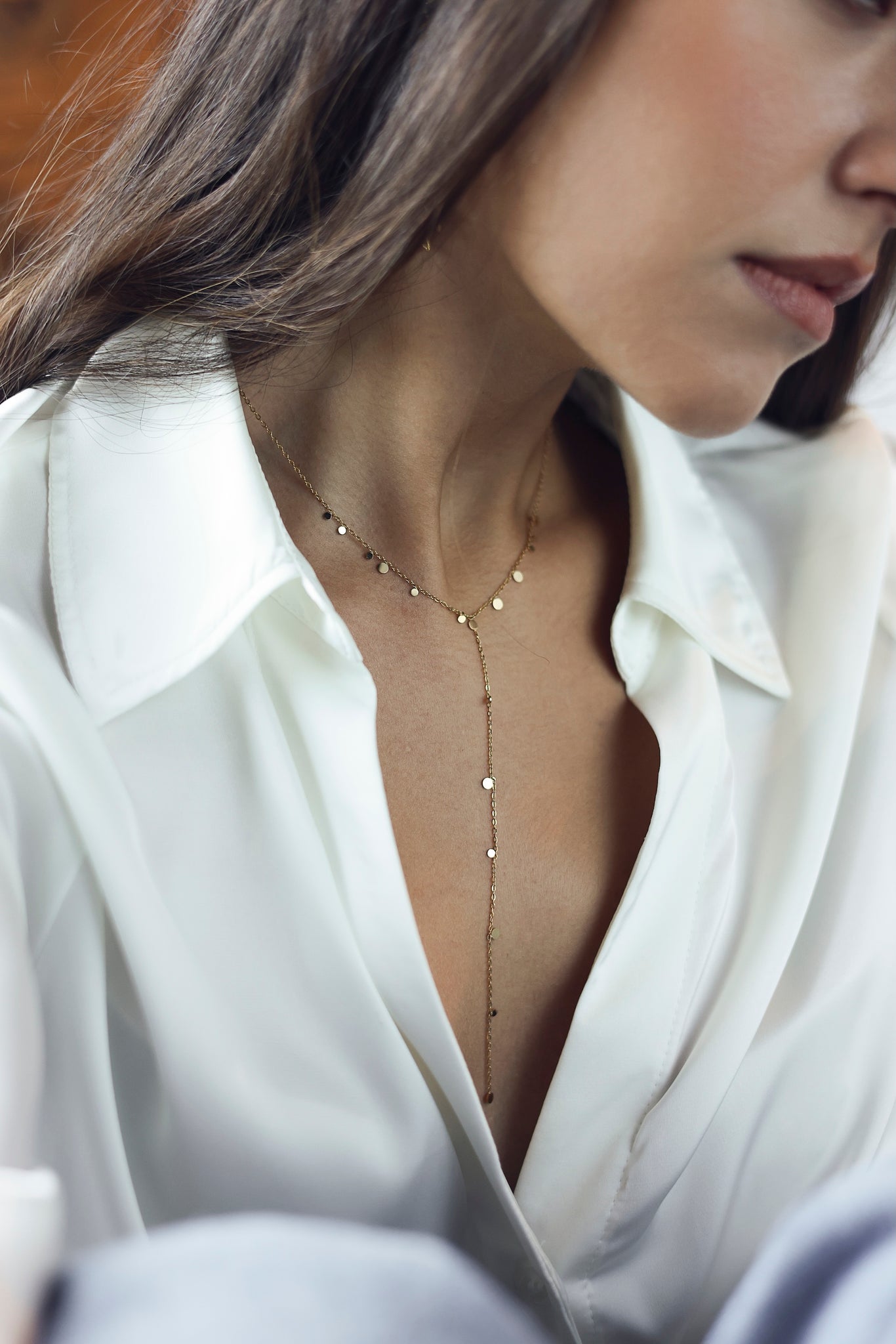 LIVY ROND - Collier doré cravate plongeant orné de petites pastilles rondes