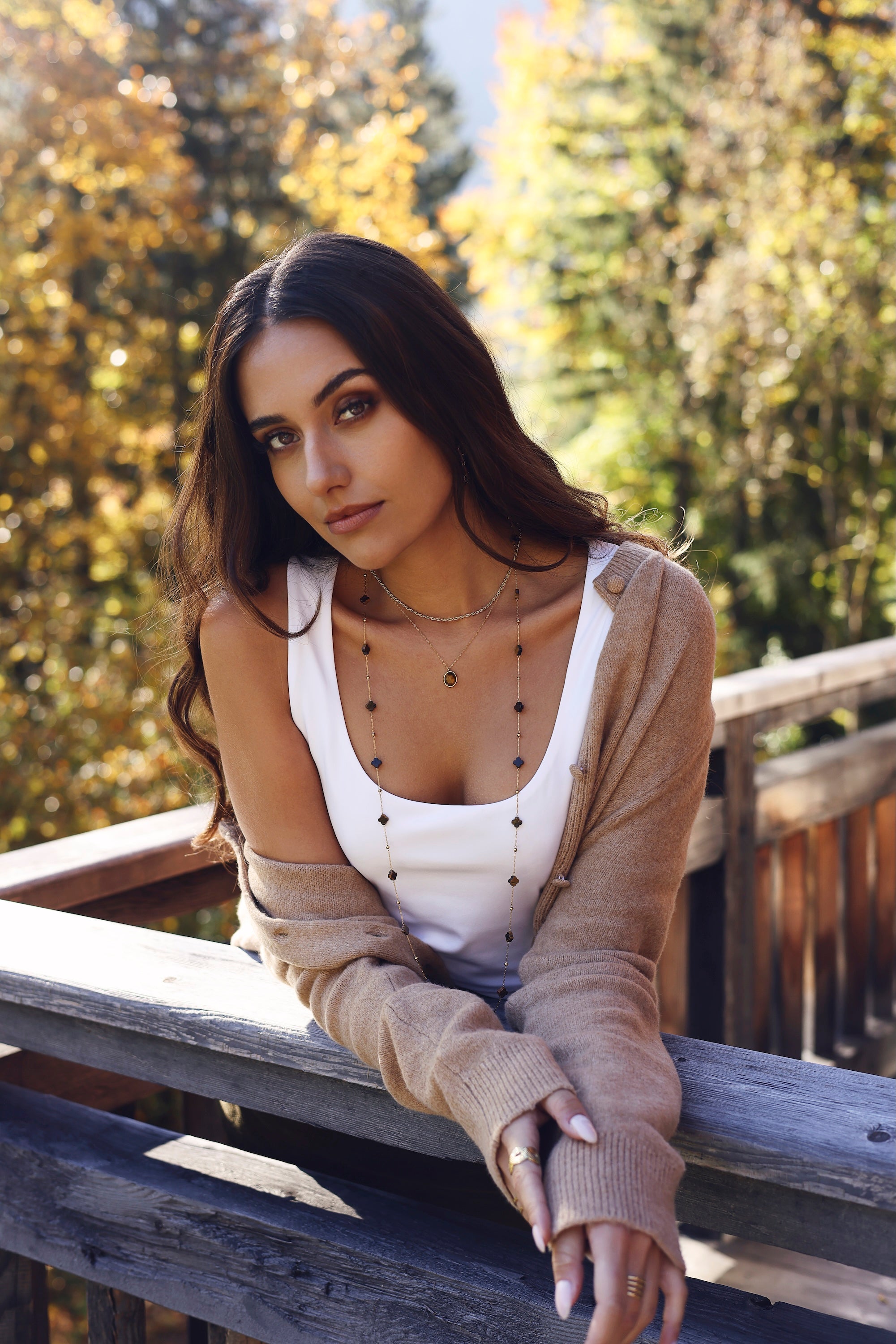 FERGI OEIL DE TIGRE - Collier sautoir doré chaîne fine orné de pierres naturelles en forme de trèfle